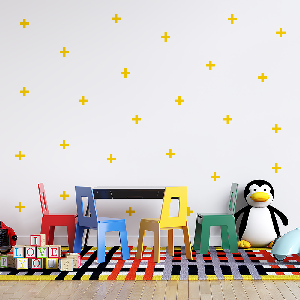 O adesivo de parede em formato Cruz está disponível em 7 opções de cores: branco, azul, rosa, combinação de rosa claro e escuro, preto, amarelo e multicores.