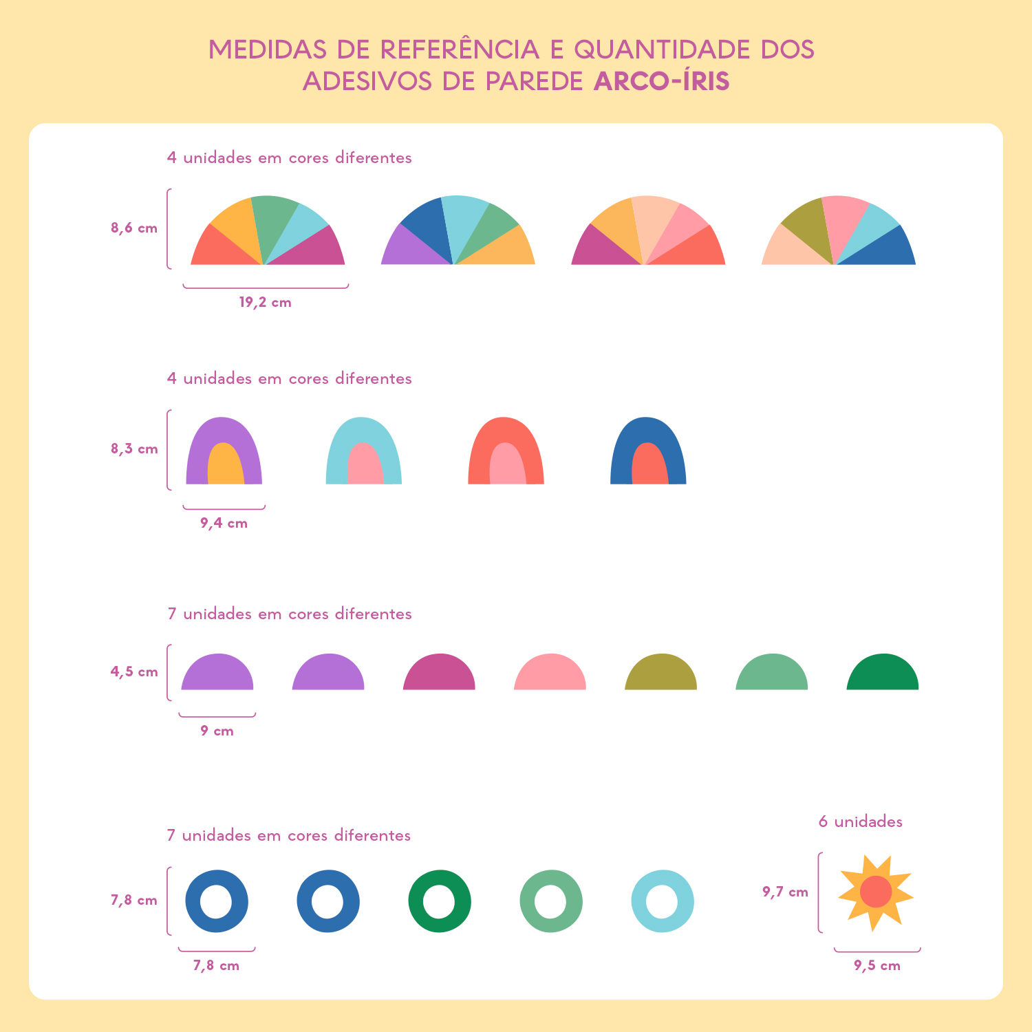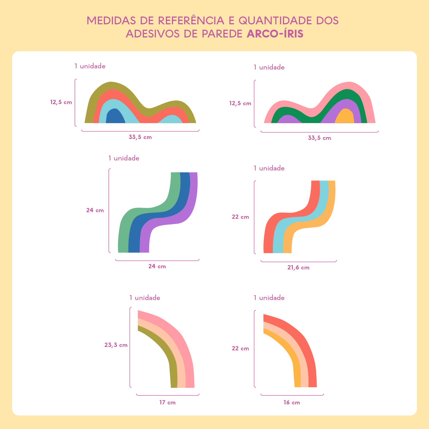 Os tamanhos de cada adesivo que compõem o tema estão disponíveis nas fotos dos produtos. Caso sua parede seja muito grande, recomendamos adquirir duas unidades para garantir uma decoração perfeita.