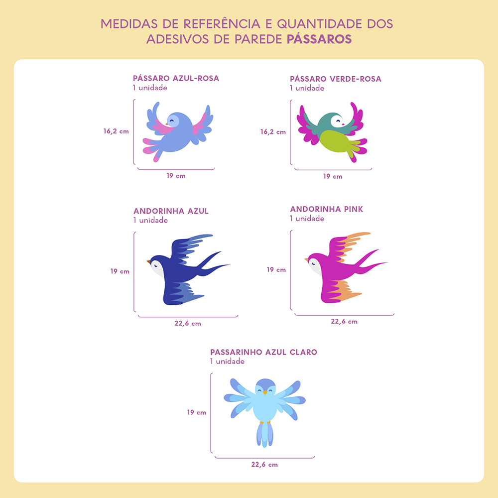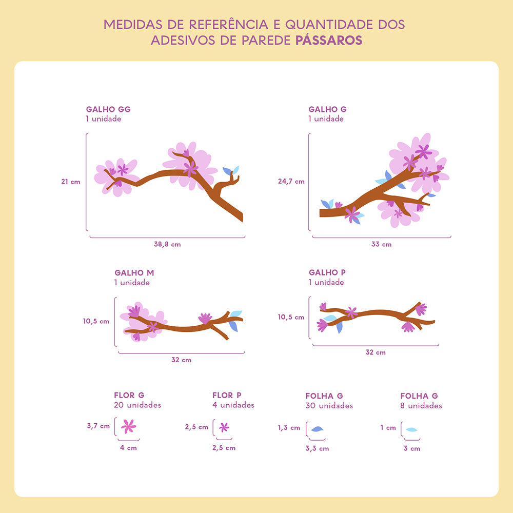 Os tamanhos de cada adesivo que compõem o tema estão disponíveis nas fotos dos produtos. Caso sua parede seja muito grande, recomendamos adquirir duas unidades para garantir uma decoração perfeita.