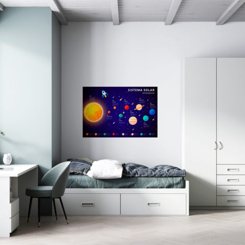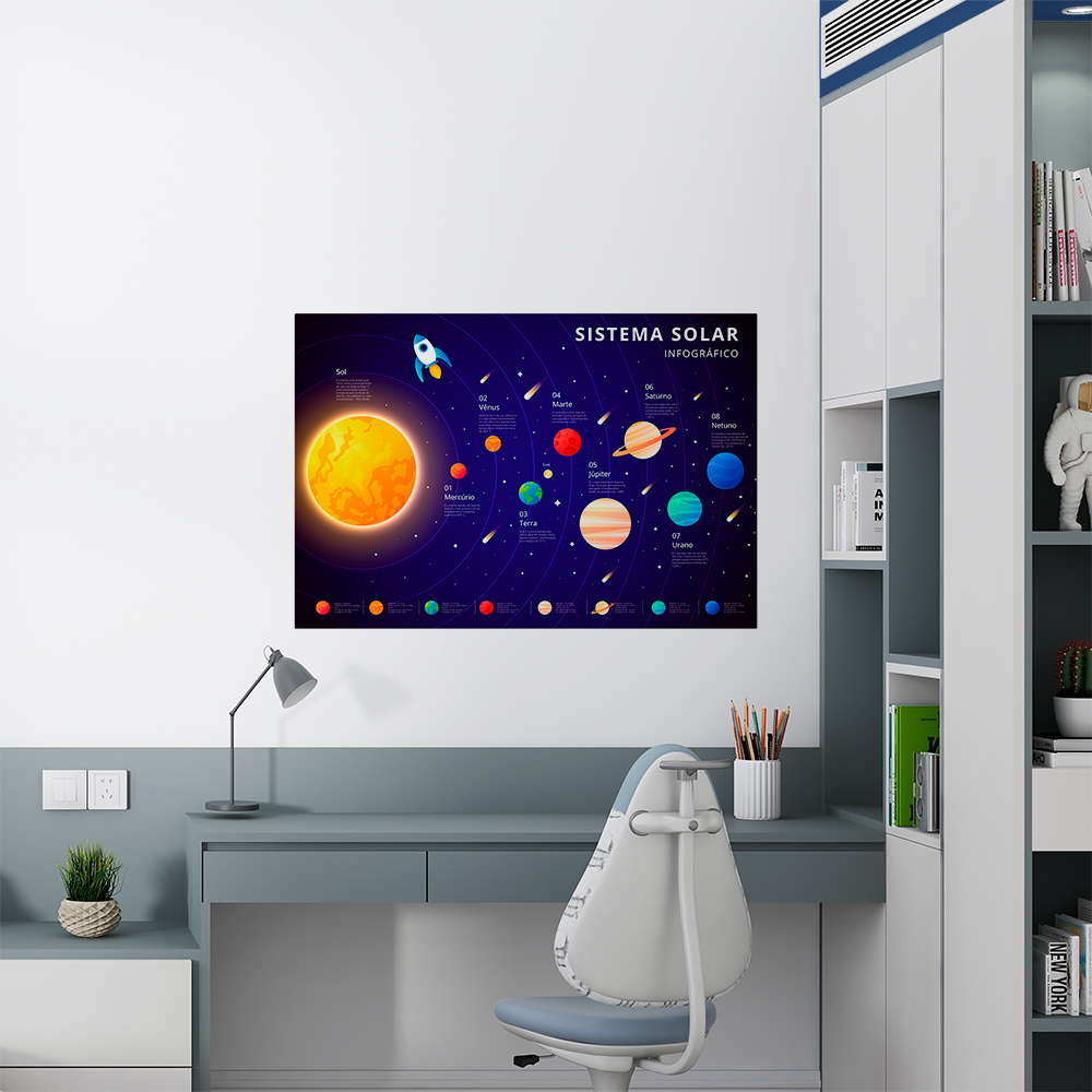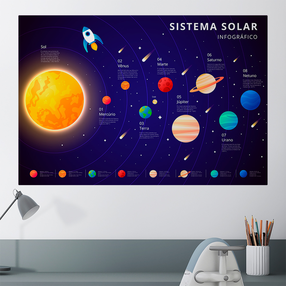 Nosso Mapa do Sistema Solar possui infográfico com breve descrição dos corpos celestes e curiosidades. Perfeito, não é mesmo?