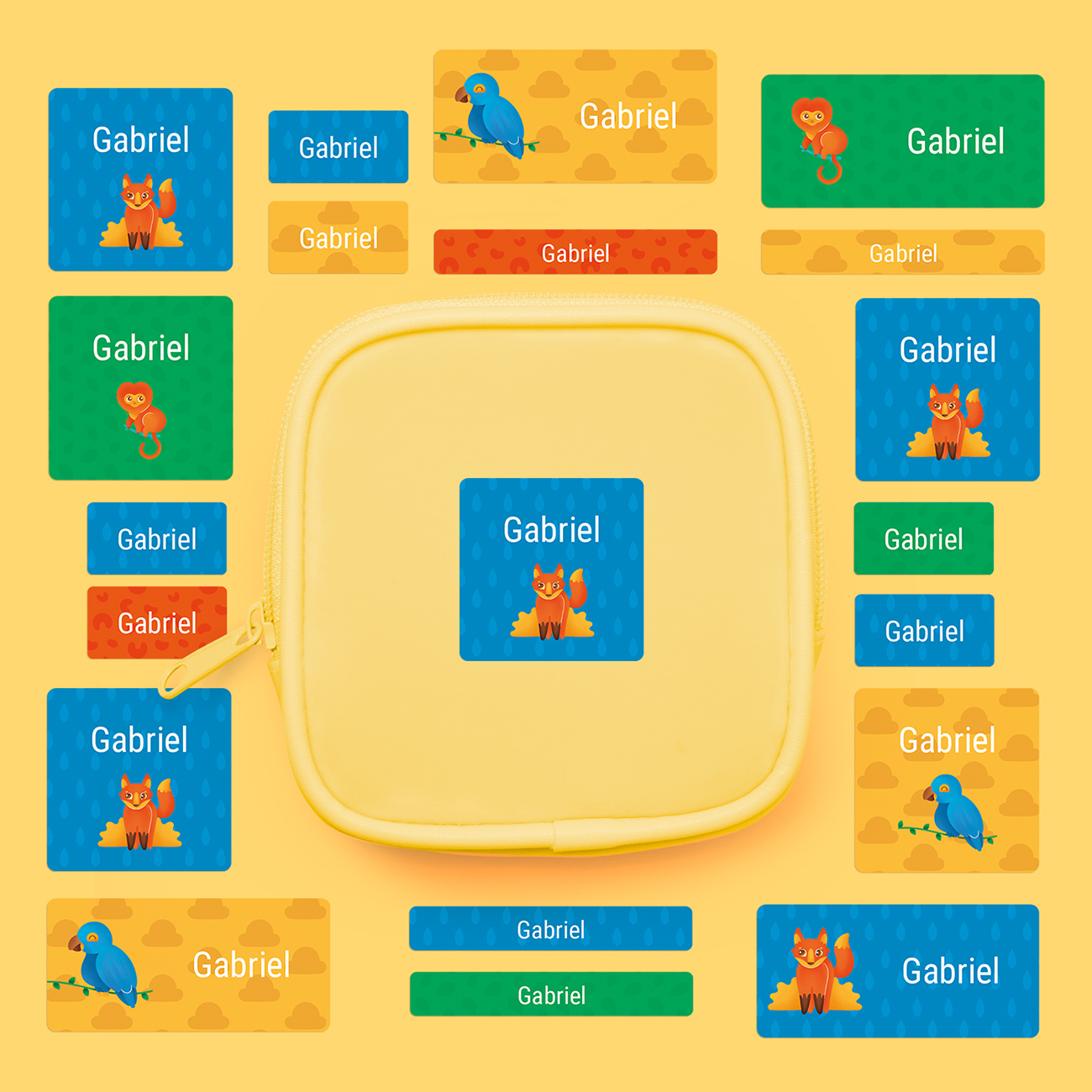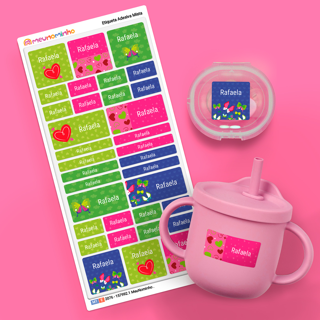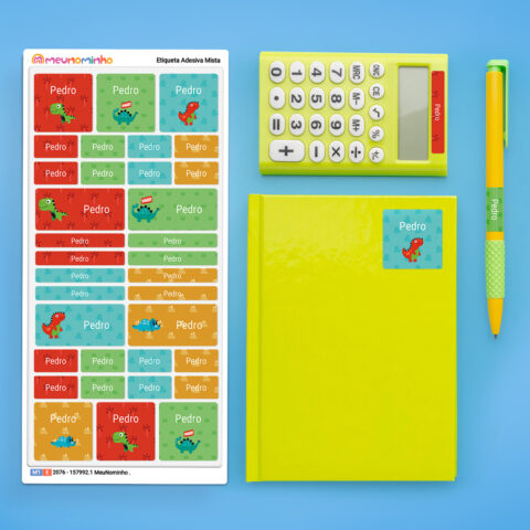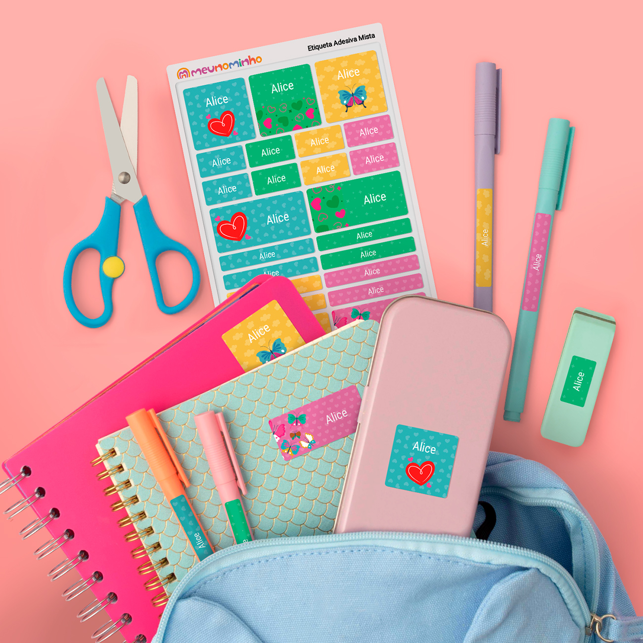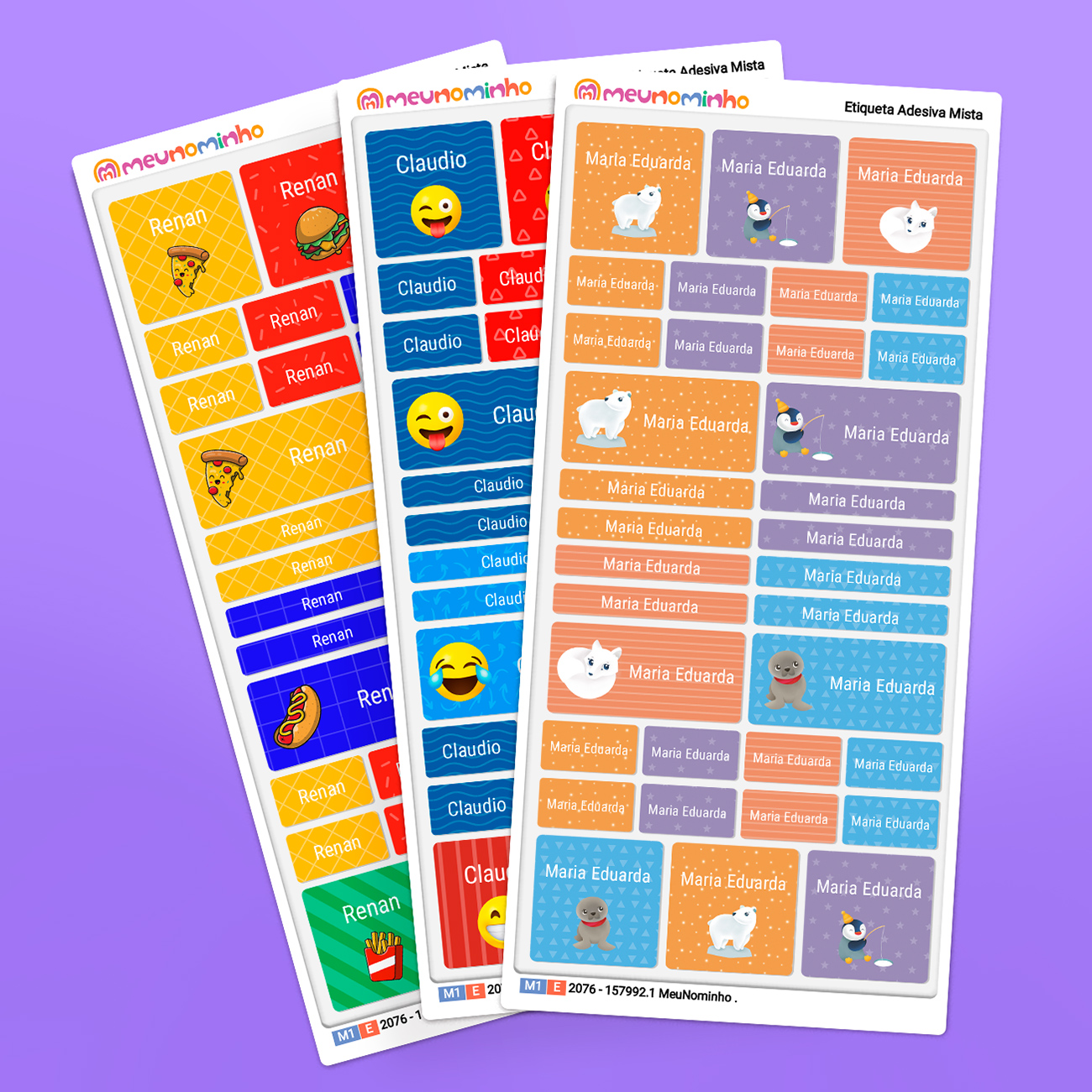 A cartela de etiquetas adesivas mista é muito versátil. Com ilustrações exclusivas e um universo de opções, é a escolha perfeita para identificar materiais escolares em tamanhos variados.